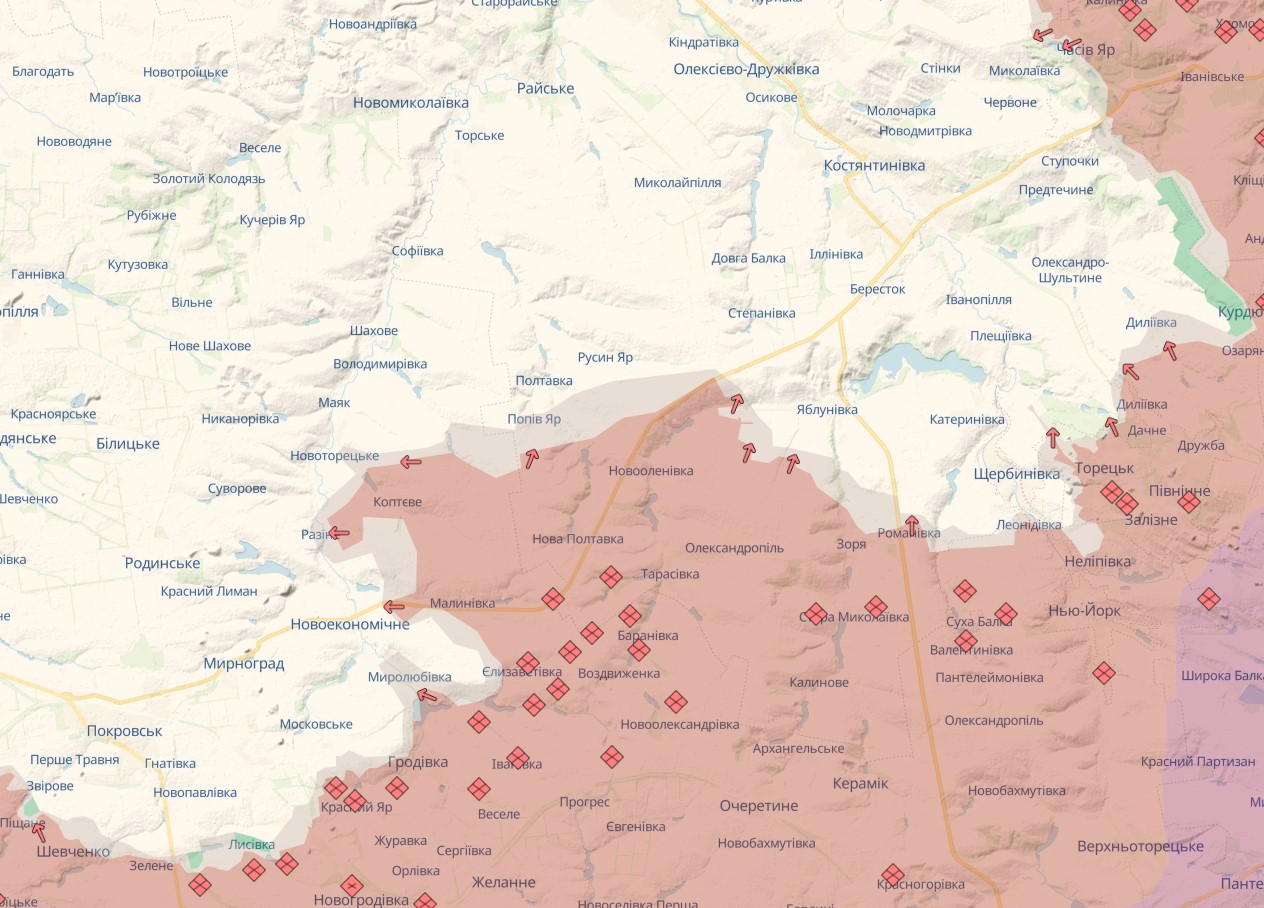 Вооруженные силы РФ продолжают смещать линию фронта на Краматорском и Новопавловском направлениях. За минувшие сутки было зафиксировано продвижение противника у населенных пунктов Новомихайловка, Романовка, Александро-Калиново, Попов Яр, Поддубное, Бойковка и Мирное.