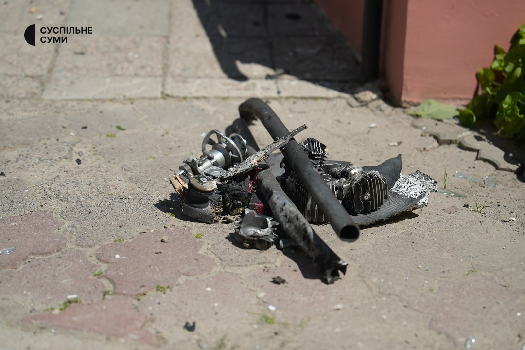 Кроме того, на одном из фото из Сум можно увидеть покрученные обломки устройства, вероятно, "Шахеда", обнаруженного на месте попадания.