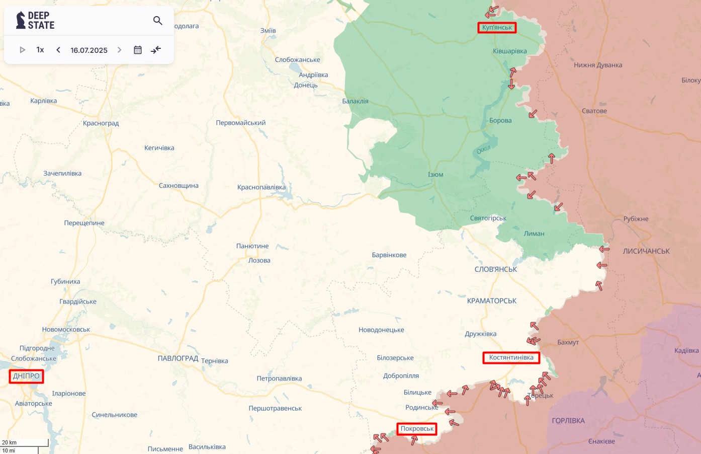 - Покровск. Россияне максимально приблизились к Родинскому, расположенному севернее Покровска. Другая угроза — оккупация села Удачное на западе. Карта боевых действий показывает, что ВС РФ имеют продвижение возле обеих точек. Если так пойдет дальше, они перережут логистику гарнизона ВСУ, который защищает город. По мнению CNN, "клещи" вокруг Покровска заставят украинцев отступать, как это было под Авдеевкой. Военный ВСУ, который пообщался с CNN, объяснил, что ситуация сложная из-за нехватки людей и оружия, как и в 2023 году (именно тогда Республиканская партия Трампа впервые притормозила предоставление оружия Украине).