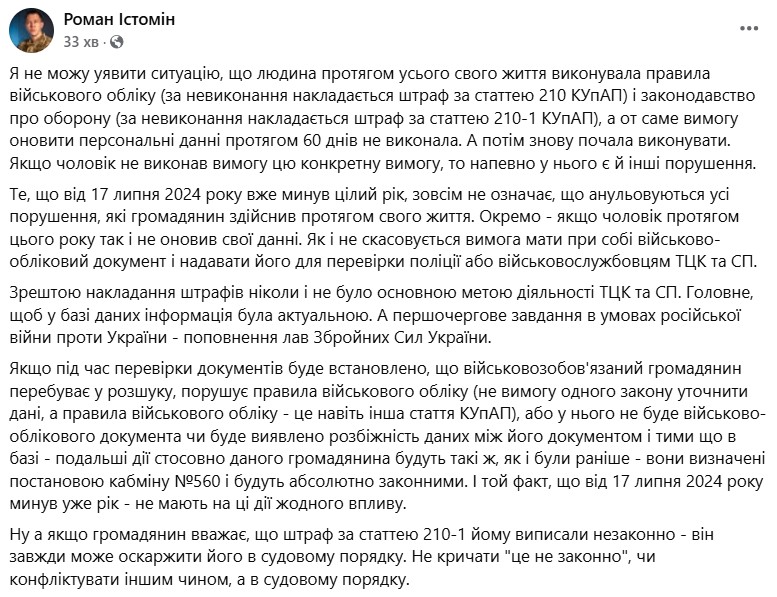 Истомин заявил, что "не может представить", чтобы гражданин до 17 июля 2024 года четко выполнял все требования правил воинского учета и законодательства об обороне, а потом вдруг что-то нарушил. Он уверен, что какие-то нарушения были, и они не аннулировались из-за того, что прошел год после 60 дней, выделенных на обновление данных. Работники ТЦК и дальше смогут действовать в соответствии с законодательством и будут наказывать за нарушение ст. 210 и 210-1 Кодекса Украины об административных правонарушениях, говорится в заметке.