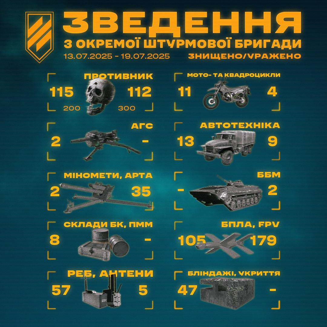 Что касается уничтоженного личного состава противника, то бойцы 3 ОШБр за неделю ликвидировали 115 оккупантов, и еще 112 вывели из строя из-за полученных ранений.