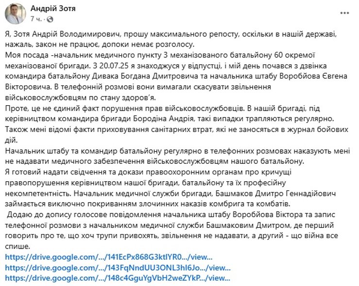 К публикации Зотя добавил голосовое сообщение начштаба и запись телефонного разговора с начальником медслужбы, где один говорит, что "хоть трупы привозят, увольнения не предоставлять", а второй уверяет, что "война все спишет".
