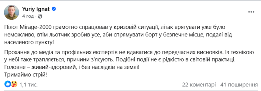Зато пилот в кризисной ситуации, утверждает Игнат, "грамотно сработал" и сделал все, чтобы направить истребитель в безопасное место — подальше от населенного пункта. Об этом начальник управления коммуникаций Воздушных сил ВСУ написал на своей Facebook-странице.