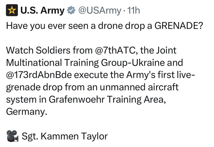 Армия США удалила пост в соцсети с видеодемонстрацией сброса гранаты с дрона, поскольку она вызвала шквал возмущения среди специалистов, потому что сброс гранат и ВОГов уже "практикуется" несколько лет. На это обратили внимание аналитики Defence Express.