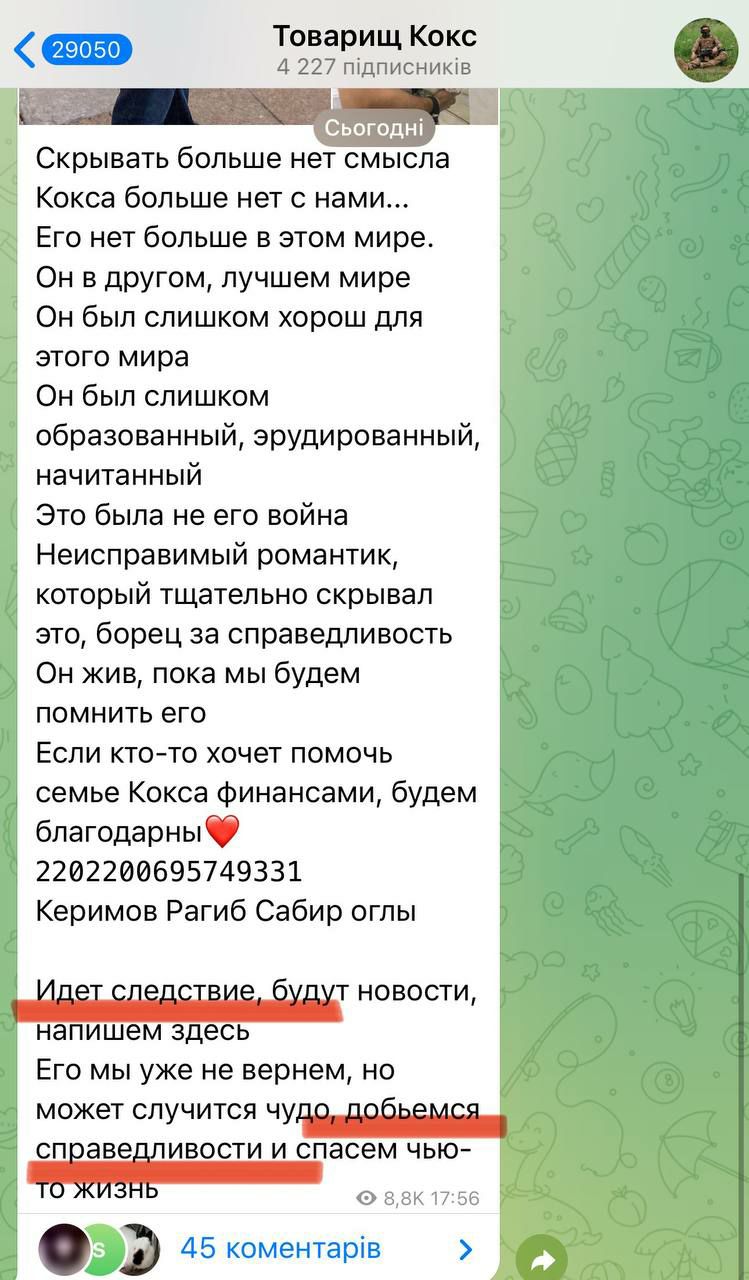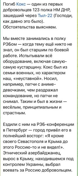 Командир подразделения РЭБ российской армии Керим Сабир-оглы Рагимов, который был основателем и автором Telegram-канала с Z-тематикой "Товарищ Кокс", призывающего убивать украинцев, ликвидирован во время отпуска, пишет журналист и военнослужащий Юрий Бутусов.
