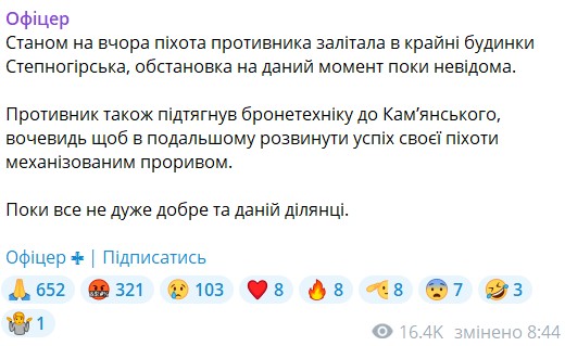 В село Степногорск проникла пехота ВС РФ, написал военных ВСУ с позывным "Алекс" в Telegram-канале "Офицер". Вместе с тем в Каменском, которое осталось в тылу россиян, готовят "механизированный прорыв", считает боец.