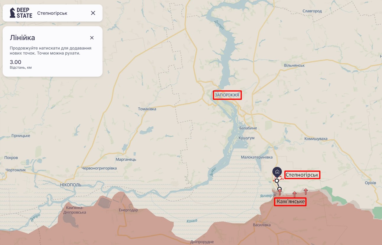 Между тем на карте боевых действий проекта DeepState видим, что село Степногорск расположено, ориентировочно, в 2 км к северу от Каменского — населенного пункта, возле которого есть атаки ВС РФ. Степногорск расположен на дороге Е105, до окраин Запорожья — около 20 км (по прямой).