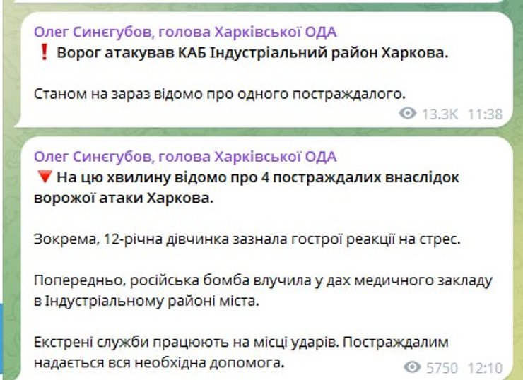 "Предварительно, российская бомба попала в крышу медицинского учреждения в Индустриальном районе города. Экстренные службы работают на месте ударов. Пострадавшим оказывается вся необходимая помощь", — написал Синегубов.
