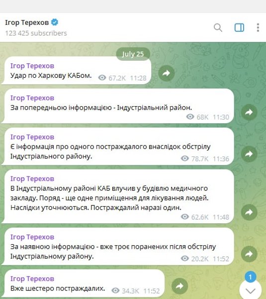 Около 11:30 днем, 25 июля, ВС РФ ударили управляемой авиационной бомбой по Харькову. Удар пришелся в Индустриальный район города, в здание одного из медучреждений. Об этом сообщил городской голова Харькова Игорь Терехов.