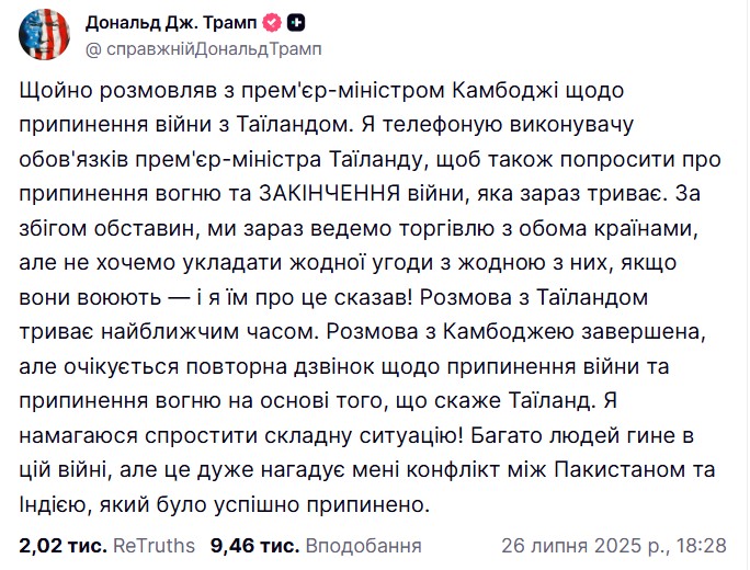 "Только что разговаривал с премьер-министром Камбоджи о прекращении войны с Таиландом. Я звоню исполняющему обязанности премьер-министра Таиланда, чтобы также попросить о прекращении огня и ОСТАНОВЛЕНИИ войны, которая сейчас идет", — написал глава Белого дома.