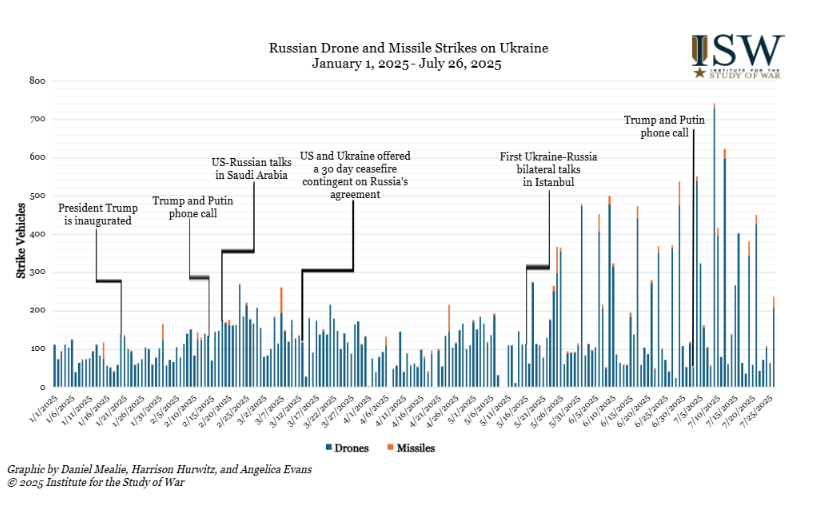 Институт изучения войны также обнародовал инфографику, которая иллюстрирует интенсивность атак ВС РФ по Украине в период с 1 января 2025 года по 26 июля 2025 года. Исследование в частности демонстрирует, как после телефонного разговора президента США Дональда Трампа и главы России Владимира Путина и проведения первого раунда переговоров Украины и РФ в Стамбуле масштабы атак увеличились.