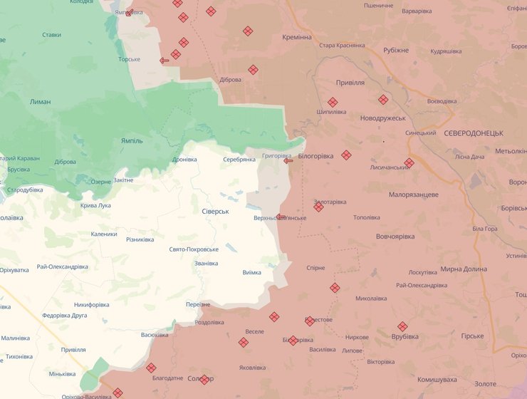 Согласно картографическим данным ресурса DeepState, за последнюю неделю противник не смог изменить линию боевого соприкосновения. Незначительные изменения были зафиксированы южнее Серебрянки и Григоровки, а также западнее Верхнекаменского, где увеличилась “серая зона”.