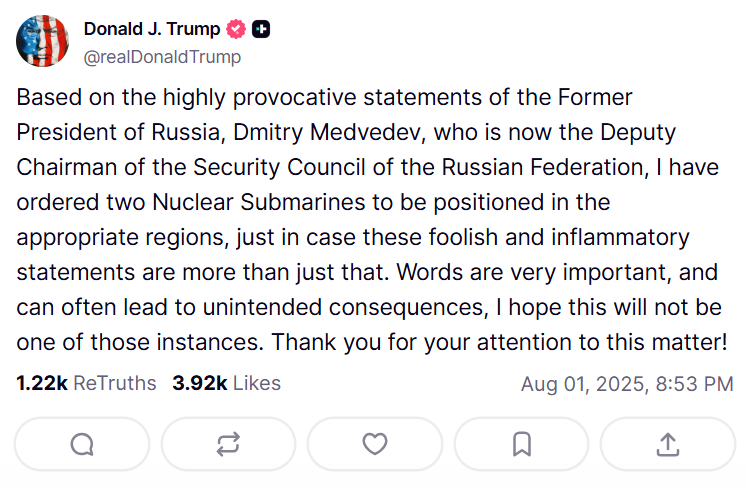 "В связи с крайне провокационными заявлениями бывшего президента России Дмитрия Медведева, я отдал приказ разместить две атомные подводные лодки в соответствующих районах на случай, если эти глупые и провокационные заявления окажутся чем-то большим", — заявил он.