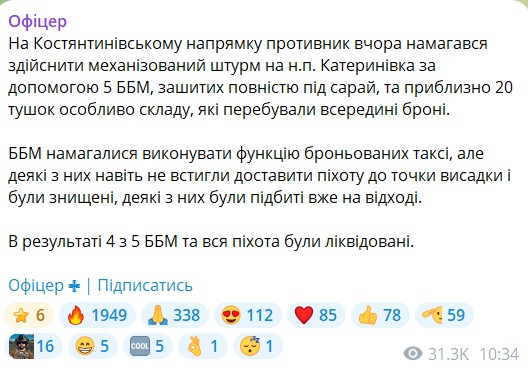 Сообщение о наступлении РФ на Константиновском направлении появилось в сети утром 4 августа. Указывается, что российские штурмовики прятались внутри бронемашин-"сараев", но это не помогло. "Алекс" отметил, что вражеское командование планировало использовать ББМ как "бронированное такси" и высадить пехотинцев в точке поближе к позициям ВСУ. Впрочем, атака РФ завершилась неудачно, подытожил он.