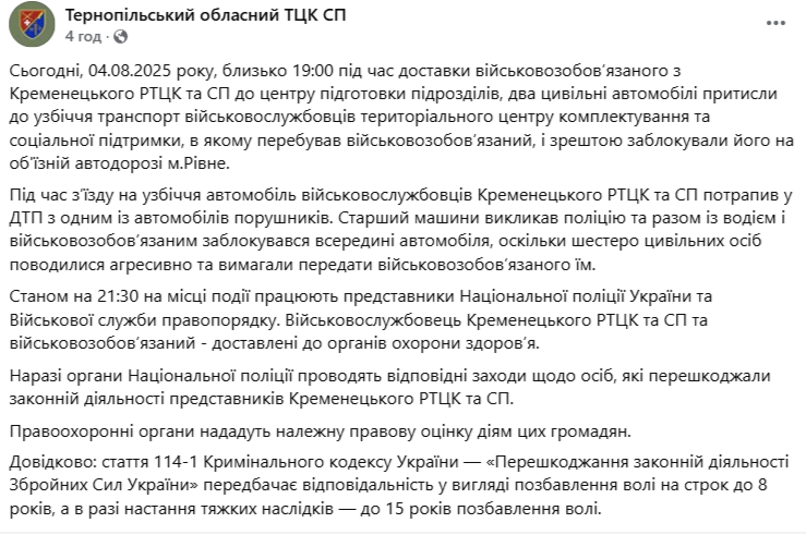 Вечером 4 августа во время перевозки военнообязанного мужчины в центр подготовки подразделений два гражданских автомобиля "прижали" к обочине транспорт ТЦК, заблокировав его в Ровно. Во время инцидента произошло ДТП с участием авто ТЦК и одного из нарушителей, а сами гражданские требовали передать мужчину им.