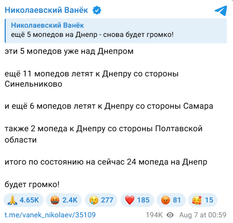В последующие минуты атака по городу продолжилась. По данным мониторинговых каналов, на Днепр двигались еще по меньшей мере 24 ударных беспилотника со стороны Синелкового, Самара и из Полтавской области.