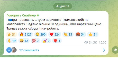 "П**ары проводят штурм Заречного (Лиманское направление) на мотобайках. Задействовано более 30 единиц, 80% пока уничтожено. Продолжается тяжелая "хирургическая" работа", — проинформировал он.