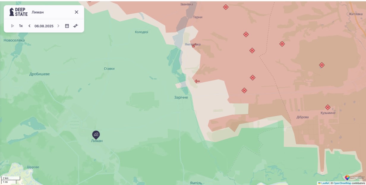 На карте Deepstate за 6 августа обозначено, что ВС РФ приближаются к населенному пункту Заречное на Лиманском направлении, и часть села находится в серой зоне.