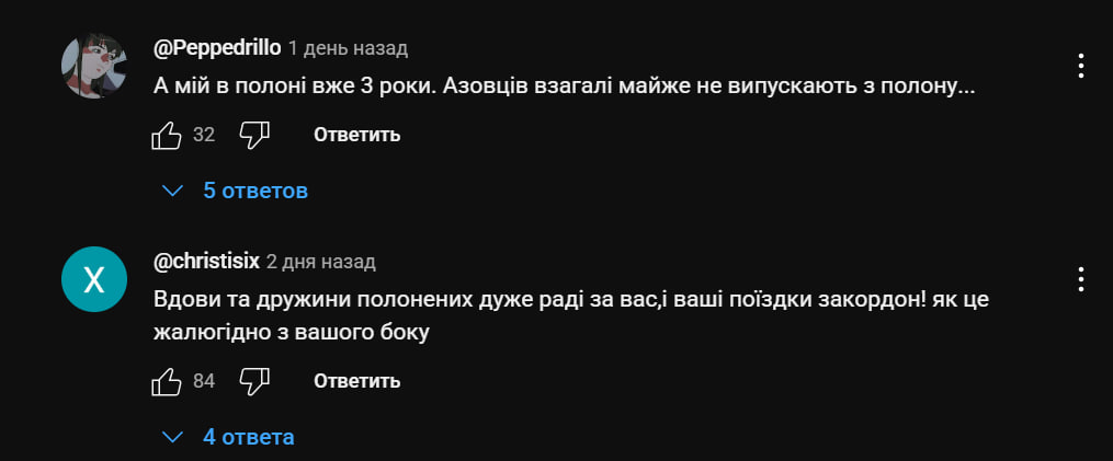 - "Вдовы и жены пленных очень рады за вас и ваши поездки за границу! Как это жалко с вашей стороны"