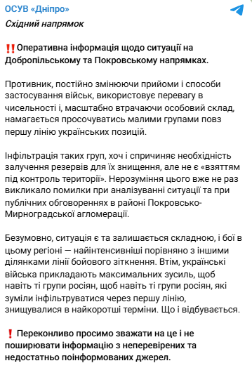 Ситуация на Добропольском и Покровском направлении остается сложной, добавили в ОСУВ "Днепр". Однако украинские защитники прилагают максимальные усилия, чтобы малые группы российских военных, которым удалось инфильтроваться через первую линию, были уничтожены "в кратчайшие сроки".