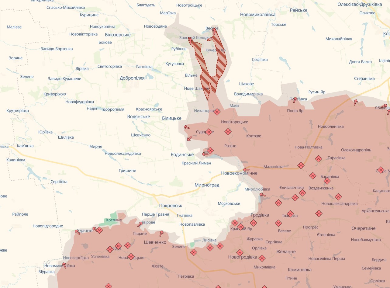 Согласно картографическим данным аналитиков, с 8 по 11 августа войска РФ имели тактический успех на северо-восточном фланге Покровского направления. Продвижение противника было зафиксировано по линии Родинское-Суворово-Никаноровка, где россияне пытаются расширить плацдарм, проводя атаки в сторону Белецкого, а также Золотого Колодца и Веселого, Донецкой области. Эти действия сопровождались нанесением рассекающего удара восточнее Доброполья, в результате чего на обширном участке фронта образовалась «серая зона».