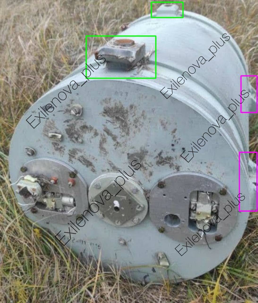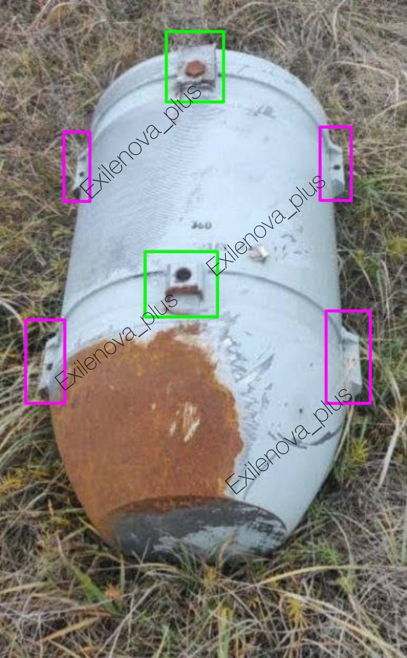 Сообщение с информацией о ракете "Нептун" появилось в сети утром 13 августа. Автор сообщения не указал, какой именно паблик РФ является источником фотографий. Между тем видим два изображения, на которых обведено шесть ключевых точек для идентификации средства поражения. Указывается, что россияне, вероятно, отыскали боевую часть "Нептуна" с боеголовкой весом 150 кг.