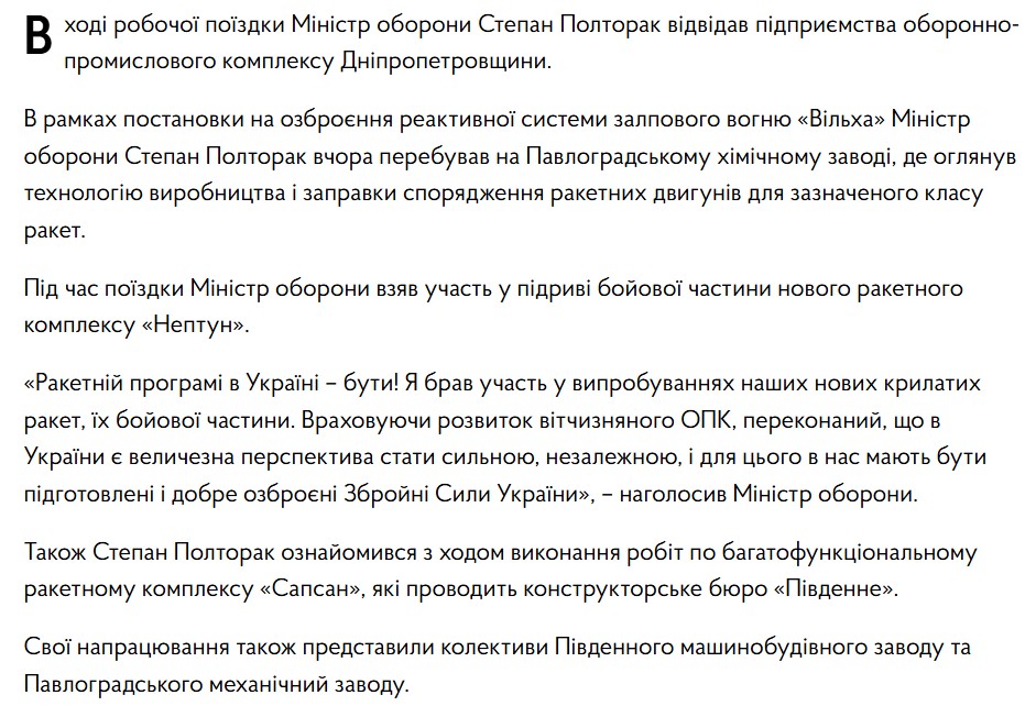 Для идентификации россияне воспользовались информацией Минобороны Украины, добавили в канале. Выяснилось, что в июне 2019 года тогдашний глава Минобороны Степан Полторак посетил Павлоградский химический завод в Днепропетровской области и наблюдал за подрывом боевой части нового ракетного комплекса "Нептун" с боеголовкой 150 кг.