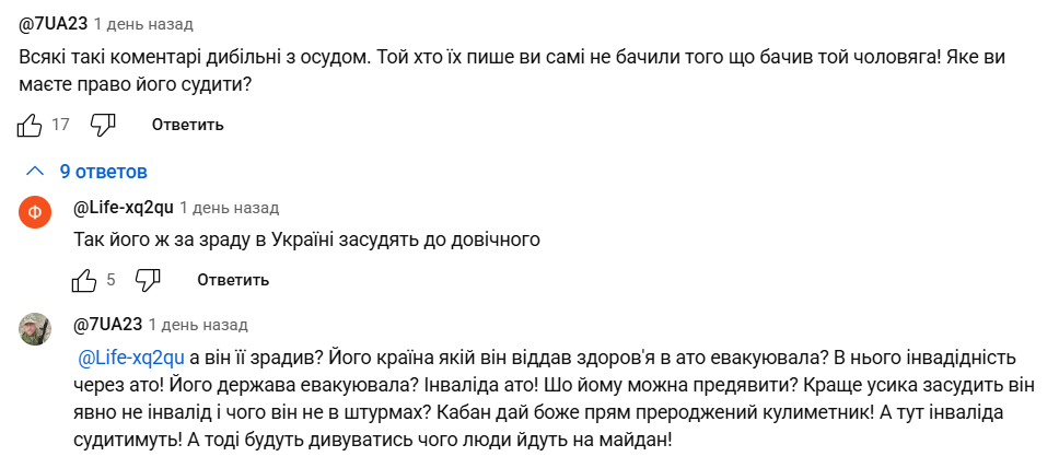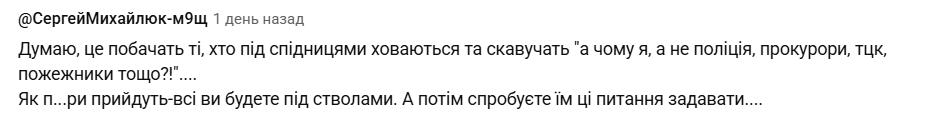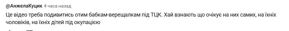 "Думаю, это увидят те, кто прячется под юбками и скулит "а почему я, а не полиция, прокуроры, тцк, пожарные и т.д.?!"… Как п…ры придут — все вы будете под стволами. А потом попробуете им эти вопросы задавать…", "Это видео нужно посмотреть тем бабкам-верещалкам под ТЦК. Пусть узнают, что ждет их самих, их мужей, их детей под оккупацией".