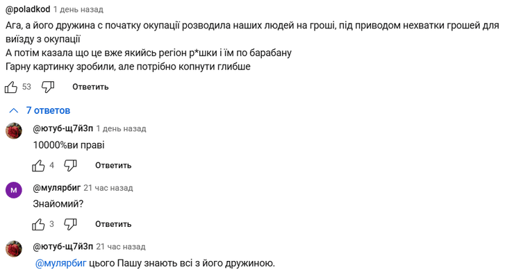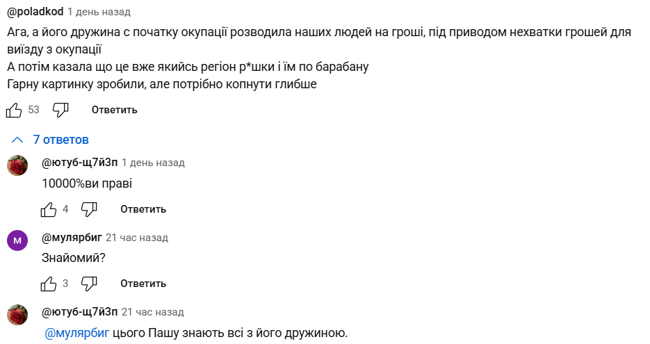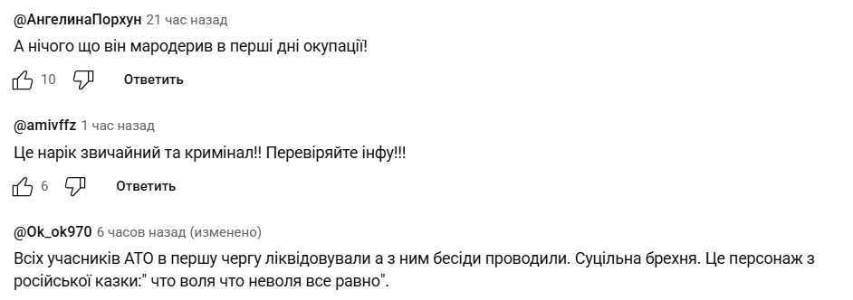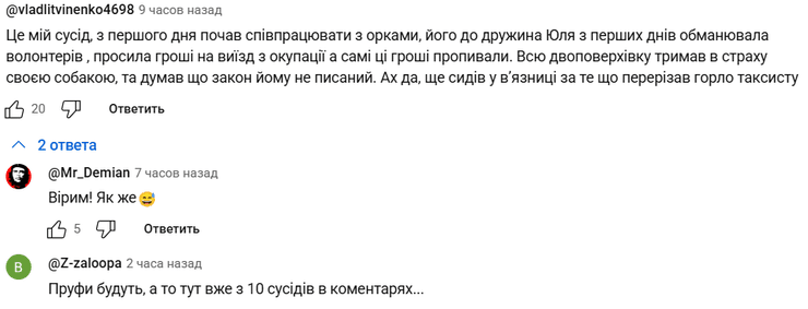 "А ничего, что он мародерил в первые дни оккупации", "Всех участников АТО в первую очередь ликвидировали, а с ним беседы проводили. Сплошная ложь. Это персонаж из русской сказки: "что воля, что неволя, все равно", "Ага, а его жена с начала оккупации разводила наших людей на деньги, под предлогом нехватки денег для выезда из оккупации. А потом говорила, что это уже какой-то регион р*шки и им по барабану. Хорошую картинку сделали, но нужно копнуть глубже", "Это мой сосед, с первого дня начал сотрудничать с орками, его жена Юля с первых дней обманывала волонтеров, просила деньги на выезд из оккупации, а сами эти деньги пропивали. Всю двухэтажку держал в страхе своей собакой, и думал, что закон ему не писан. Ах да, еще сидел в тюрьме за то, что перерезал горло таксисту", – рассказывают третьи.