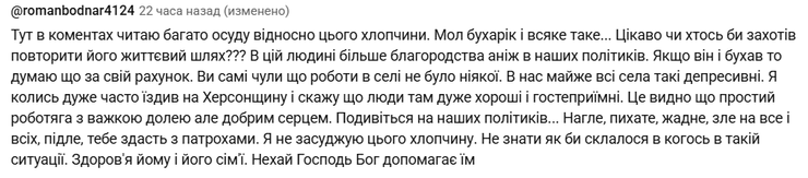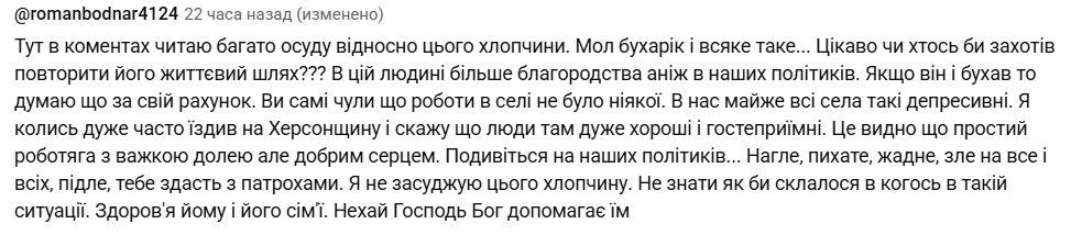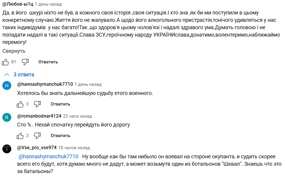"В его шкуре никто не был, у каждого своя история, своя ситуация. И кто знает, как бы мы поступили в этом конкретном случае. Жизнь его не щадила. А что касается его алкогольной зависимости, то ничего удивительного, у нас таких индивидуумов много! Так что здоровья этому человеку и в дальнейшем здравого ума", "Здесь в комментариях читаю много осуждения в отношении этого парня. Мол, бухарик и все такое… Интересно, кто-нибудь хотел бы повторить его жизненный путь??? В этом человеке больше благородства, чем в наших политиках… Я не осуждаю этого парня. Не знаю, как бы сложилось у кого-то в такой ситуации. Здоровья ему и его семье", "Все такие комментарии глупы и осуждающие. Тот, кто их пишет, вы сами не видели того, что видел этот человек! Какое вы имеете право его судить?" – отмечают одни.