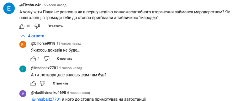 "А почему же ты, Паша, не рассказал, как в первую неделю полномасштабного вторжения занимался мародерством? Как наши ребята из общины привязали тебя к столбу с табличкой "мародер"?" – говорит пользователь под ником Elesha.