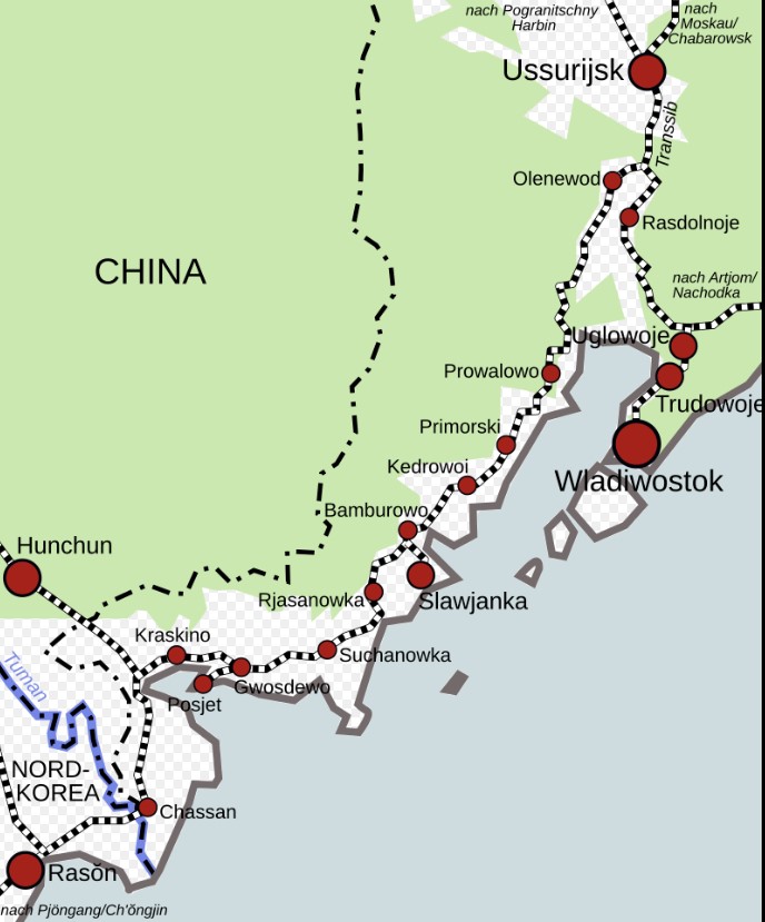 Железнодорожное сообщение между КНДР и Россией проходит через пограничную станцию Хасан. Этот маршрут, который с января 2024 года функционирует на постоянной основе, используется преимущественно для поставок артиллерийских боеприпасов и артиллерийского вооружения.