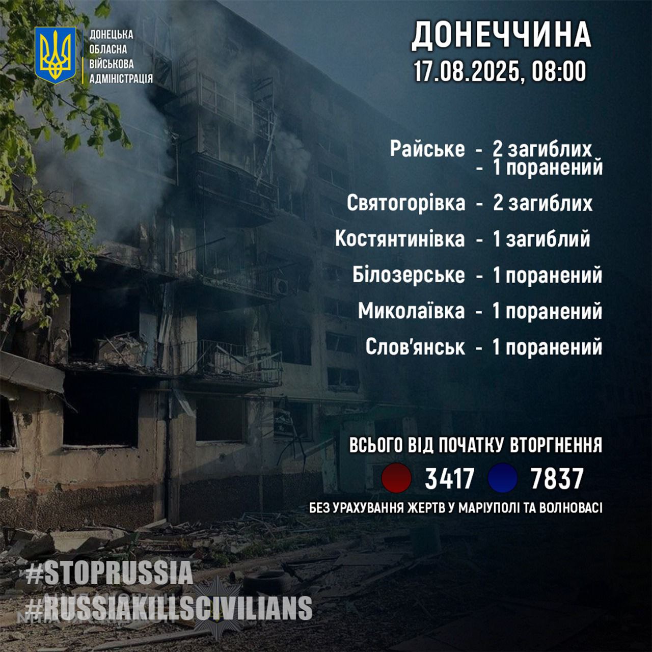 Глава Донецкой ОВА Вадим Филашкин сообщил, что за сутки россияне убили 5 жителей региона: по 2 в Райском и Святогоровке, 1 в Константиновке. Еще 4 человека в области за сутки получили ранения.
