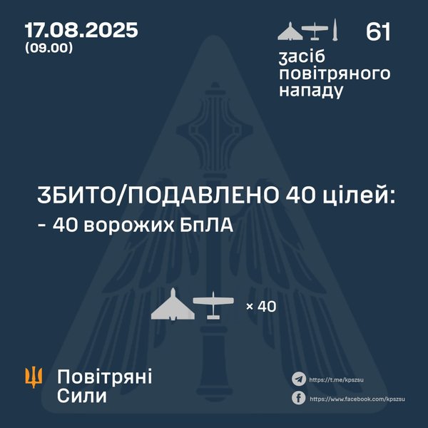 В ночь на 17 августа россияне атаковали украинские города баллистической ракетой Искандер-М и 60-ю ударными БпЛА типа Shahed и беспилотниками-имитаторами различных типов.
