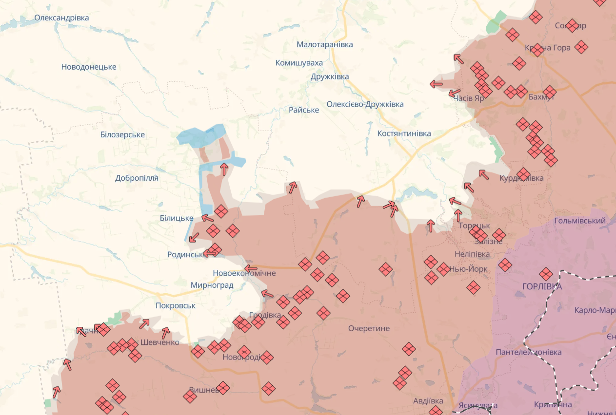 Аналитики DeepState сообщили о рывке ВС РФ на Покровском направлении возле Доброполья 11 августа. На карте можно было увидеть продвижение оккупантов вглубь украинских позиций в Кучеров Яр и Золотой Колодец примерно на 10 км. Генеральный штаб ВСУ тогда подтвердил "просачивание" россиян и сообщил, что решением главнокомандующего Александра Сирского были выделены дополнительные силы для "выявления и уничтожения диверсионных групп противника".