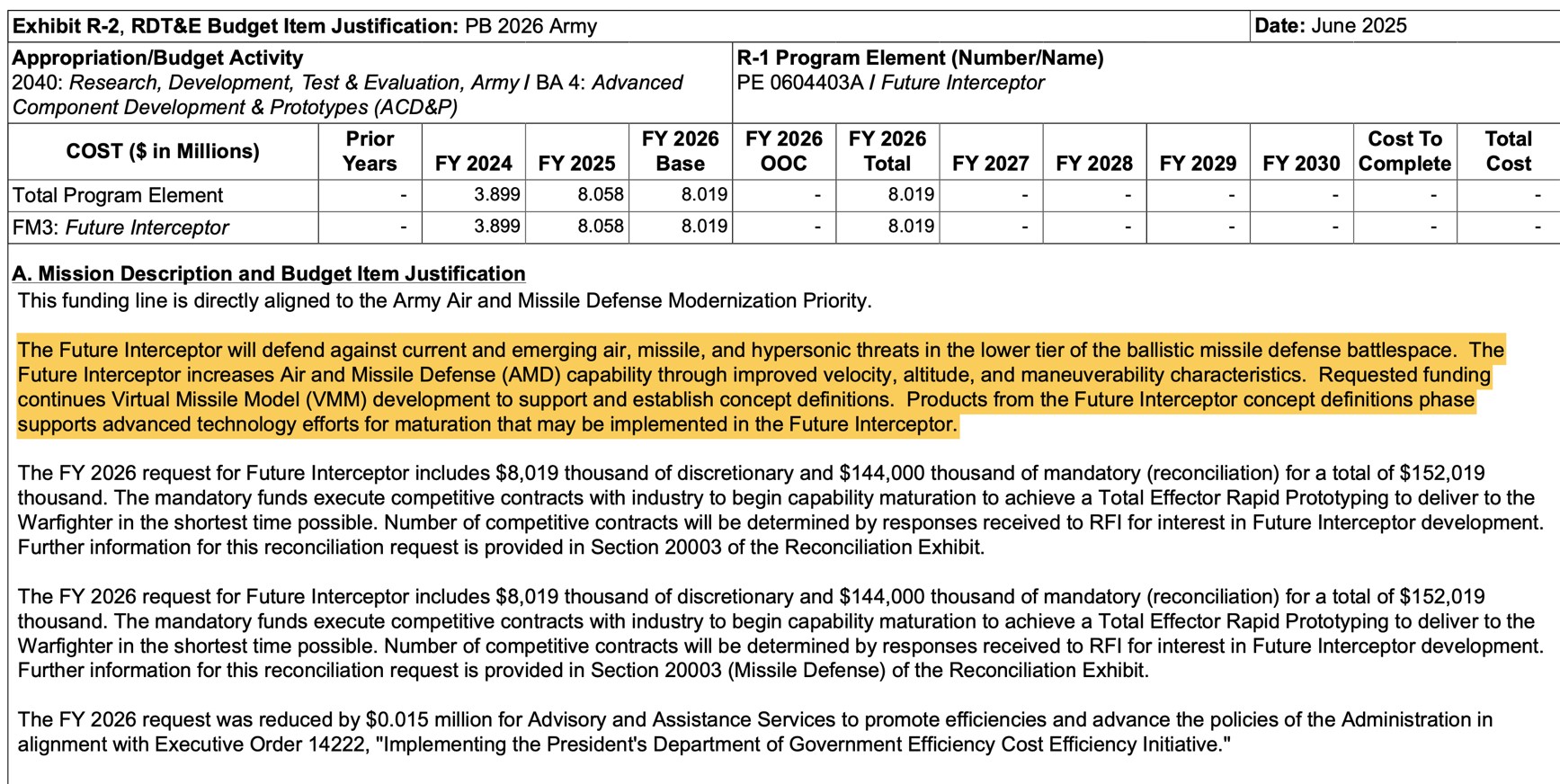 Финансирование в рамках программы Lower Tier Future Interceptor (LTFI) на 2026 год будет направлено на исследования, разработку, испытания и оценку перспективной ракеты. Об этом 19 августа сообщил обозреватель по вопросам безопасности в The Insider Колби Бадхвар со ссылкой на сведения из Пентагона.