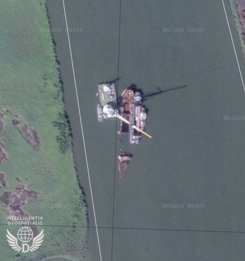Рядом с полузатонувшим кораблем "Порт Оля-4" стоит кран и буксир, объяснил OSINTер в Telegram-канале "Dnipro Osint ⟨ Гарбуз ⟩". Автор сообщения отметил, что судно стало "трупом", который россияне пытаются спасти и поднять из воды.