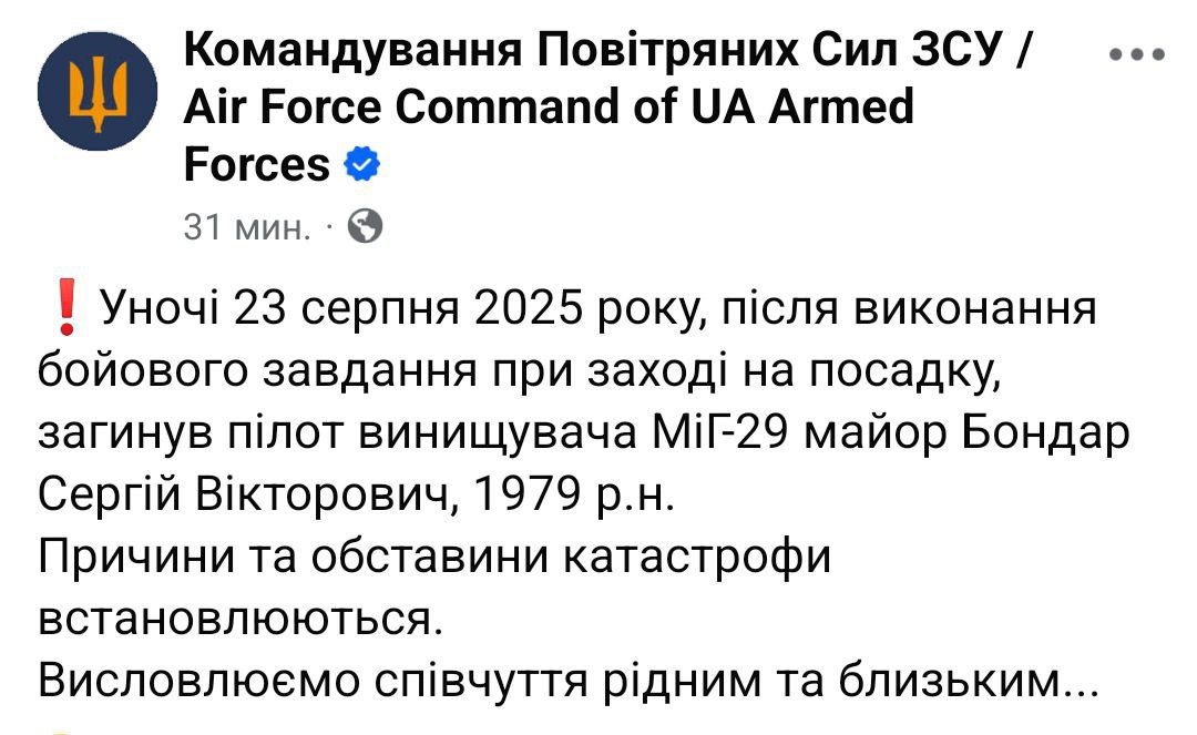 В ночь на 23 августа при заходе на посадку погиб пилот истребителя МиГ-29 Сергей Бондарь.