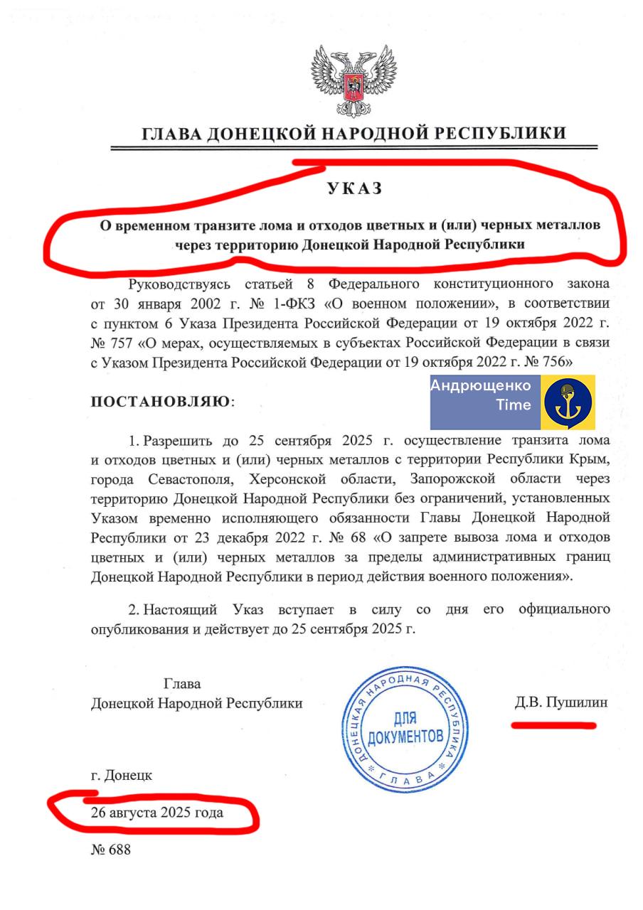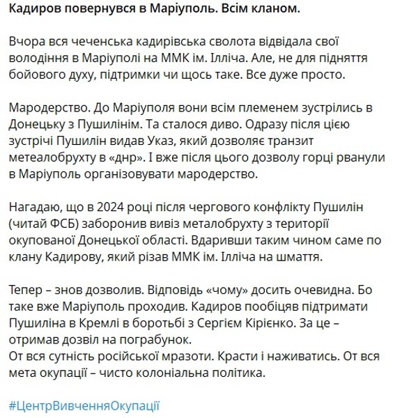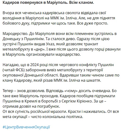 Андрющенко напомнил, что в 2014 году после конфликт с кадыровцами Пушилин, за которым якобы стоит ФСБ, запретил вывоз металлолома с территории оккупированной Донецкой области, что сильнее всего ударило по клану Кадырову, резавшему ММК им. Ильича на куски.