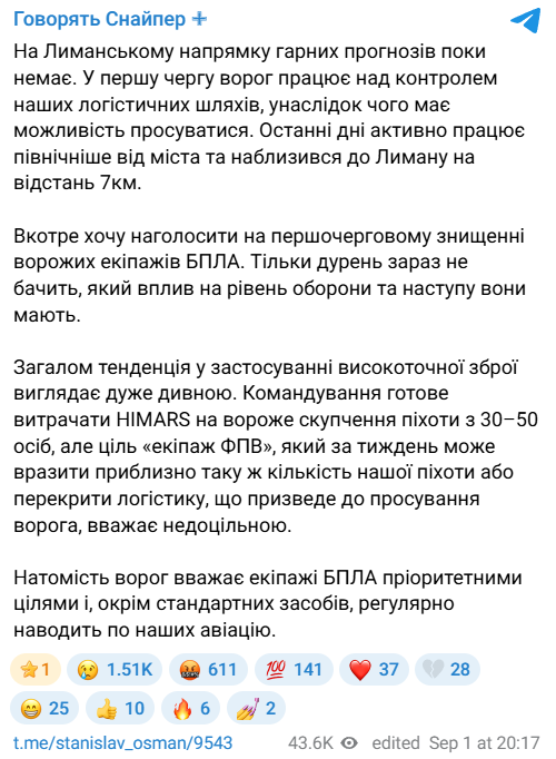 Боец 24-го отдельного штурмового батальона "Айдар" Вооруженных сил Украины 1 сентября опубликовал сообщение в своем Telegram-канале "Говорят Снайпер", в котором отметил, что ситуация на Лиманском направлении в Донецкой области остается сложной и "хороших прогнозов пока нет". По его словам, россияне в первую очередь пытаются взять под контроль логистические пути, чтобы получить возможности для продвижения.