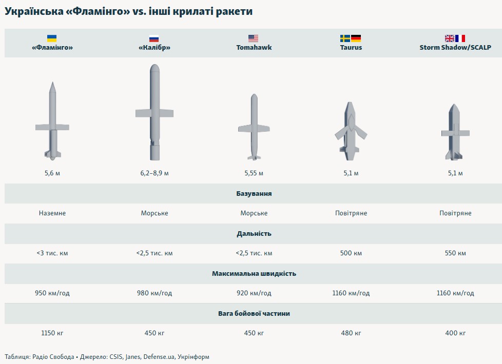 - Ракета "Фламинго" — разработка компании Fire Point, которая похожа на аналог Milanion FP-5 компании Британии-ОАЭ Milanion Group. Медиа сравнило характеристики различных средств поражения и выяснилось, что "Фламинго" несколько короче "Калибра" РФ, но почти такая же, как Tomahawk (США), или TAURUS, или Storm Shadow. Кроме того, украинская разработка вдвое тяжелее российской ракеты, но имеет такую же скорость и летит на 500 км дальше. Специалисты CIT добавили, что конструкция двигателя и объем топлива позволяет лететь 3,5 часа, что соответствует заявленным 3 тыс. км. Хинц отметил, что недостатки "Фламинго" — большие размеры и не сверхзвуковая скорость, но удары дронов ВСУ показали, что и с такими параметрами можно пройти систему ПВО РФ.