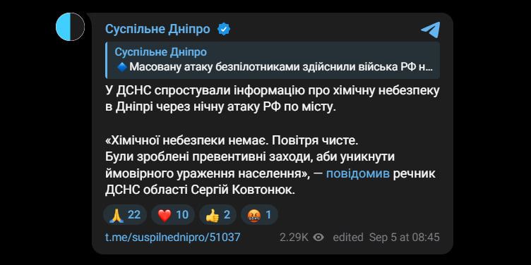 В частности подписчики одного из медиа отмечали, что объявления звучали в районе Слобожанского проспекта — одной из главных улиц Днепра. В сети также появились видеокадры, на которых слышно, как на улицах распространяют сообщения о вероятной химической опасности.