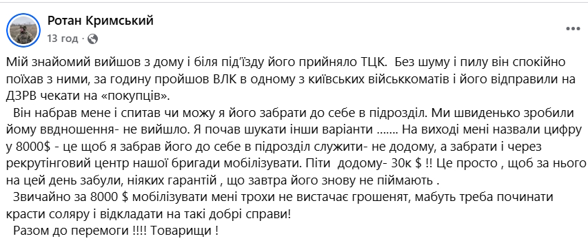 О ситуации, которая недавно произошла с военнообязанным жителем столицы в ТЦК, рассказал командир разведывательного взвода 28 бригады ВСУ с ником Ротан Крымский.
