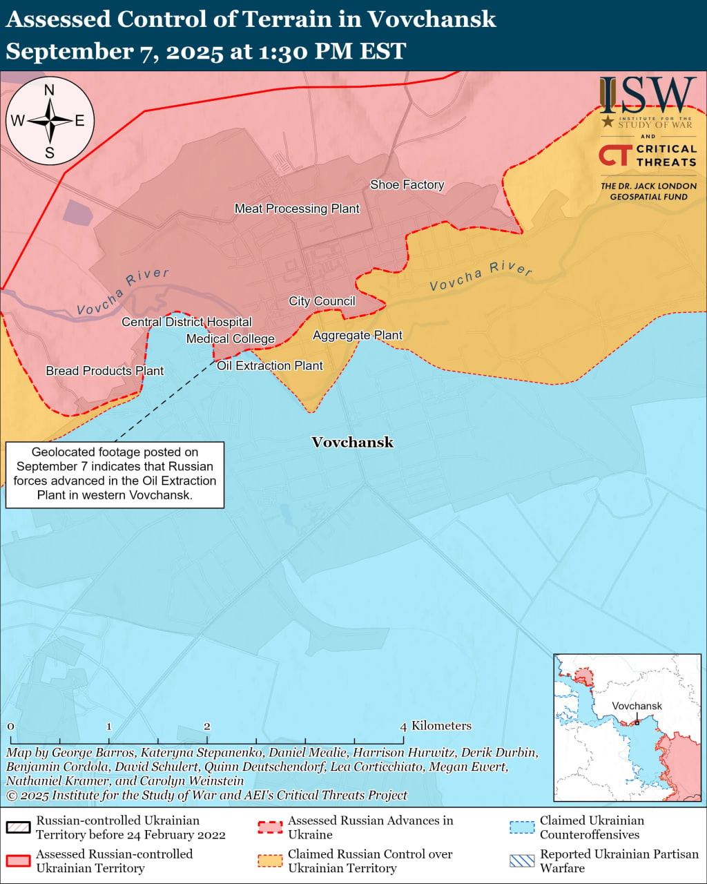 По информации ISW, геолокационные материалы от 7 сентября свидетельствуют, что российские подразделения продвинулись к Волчанскому нефтеэкстракционному заводу к северо-востоку от Харькова. В то же время российские милблогеры заявляют о движении оккупантов на 200 метров в лесном массиве возле Синельниково. 6–7 сентября армия РФ вела наступательные действия вблизи Волчанска и в направлении Синельниково, тогда как украинские войска осуществили контратаку в Волчанске.