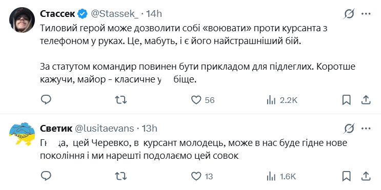 "Тыловой герой может позволить себе "воевать" против курсанта с телефоном в руках. Это, пожалуй, и есть его самый страшный бой. По уставу командир должен быть примером для подчиненных. Коротко говоря, майор — классическое у**бище", — написал один из комментаторов.