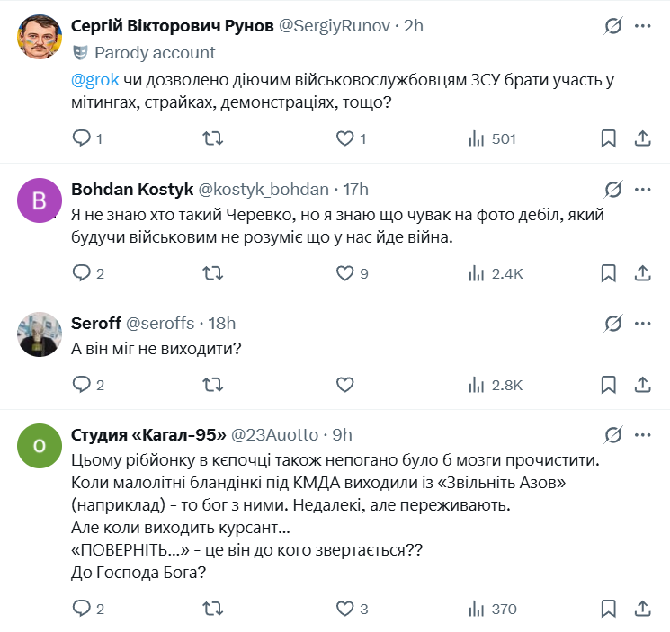 В то же время некоторые из комментаторов под заметкой наоборот осудили курсанта за участие в демонстрации во время войны и стали на сторону майора Черевко.
