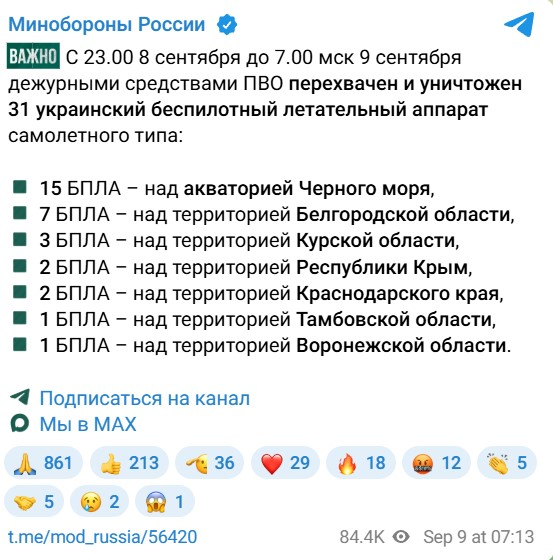 Минобороны РФ сообщило, что за ночь якобы удалось сбить 31 украинский дрон. 15 из них были уничтожены в небе над Черным морем, еще семь над территорией Белгородской области и по три в Курской области и в оккупированном Крыму.