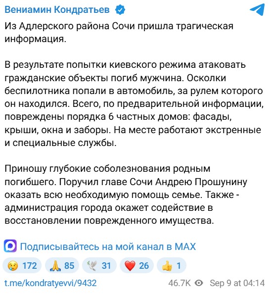 По данным российских властей, в Адлерском районе обломки дрона упали на автомобиль, осколки попали в окно в результате чего погиб водитель. Канал Astra опубликовал видео, где в городе слышны звуки воздушной тревоги.