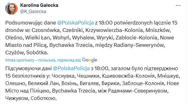 Тем временем, представительница Министерства внутренних дел и администрации Каролина Галецка сообщила, что на территории Польши уже обнаружено 15 российских дронов и предоставила список мест, где их обнаружили.