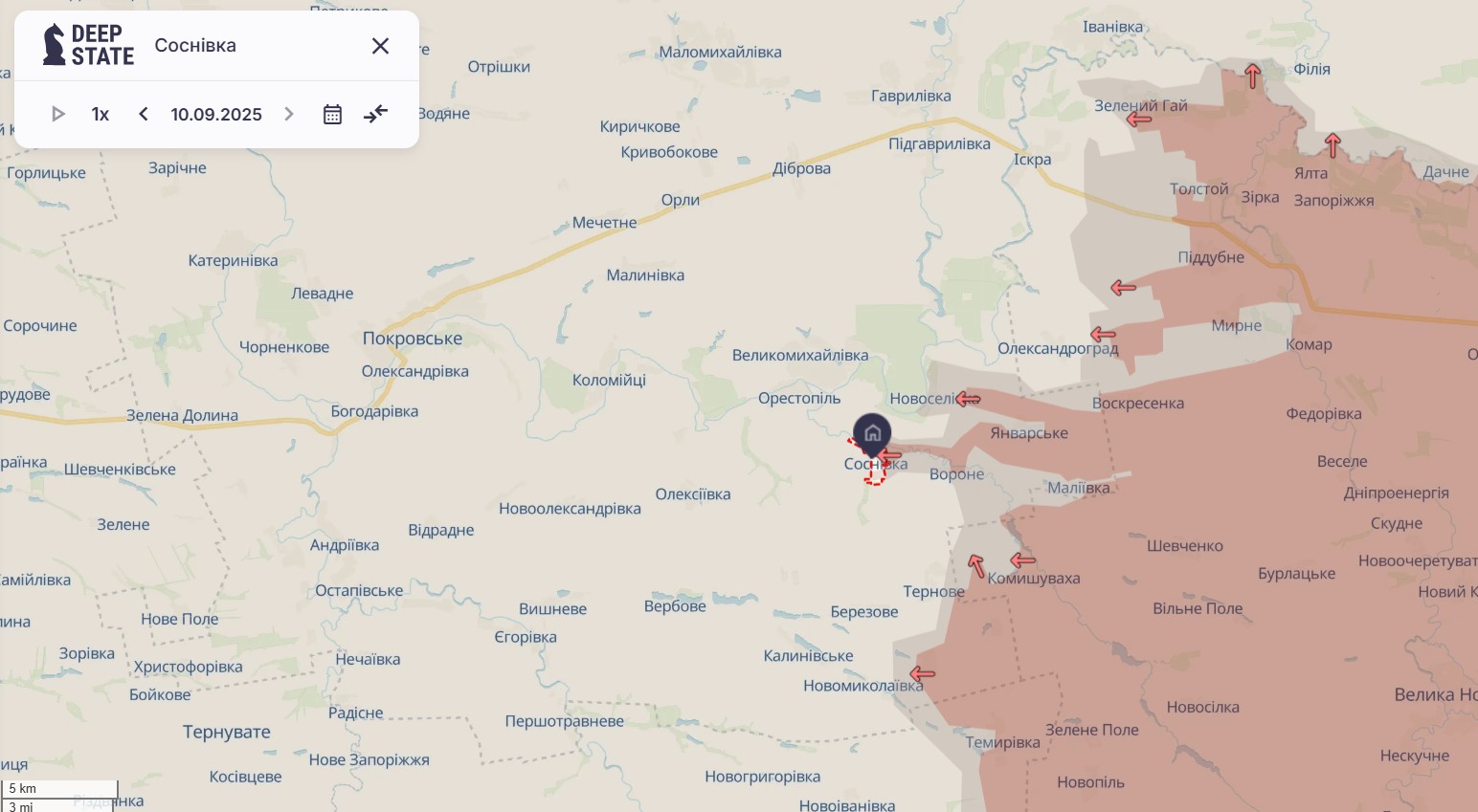 На карте боевых действий проекта DeepState, которая составляется на основе данных Генштаба ВСУ и военных, село Сосновка не обозначено как полностью оккупированное. Аналитики показали, что ВС РФ продвинулись по реке Ворона и проникли на восточные окраины населенного пункта (площадь 940 кв. км, до войны жило 200 человек). "Язык" российских войск тянется на 10 км вглубь Днепропетровской области: зона прорыва раздвоена, а в промежутке — "серая зона" возле села Январское.